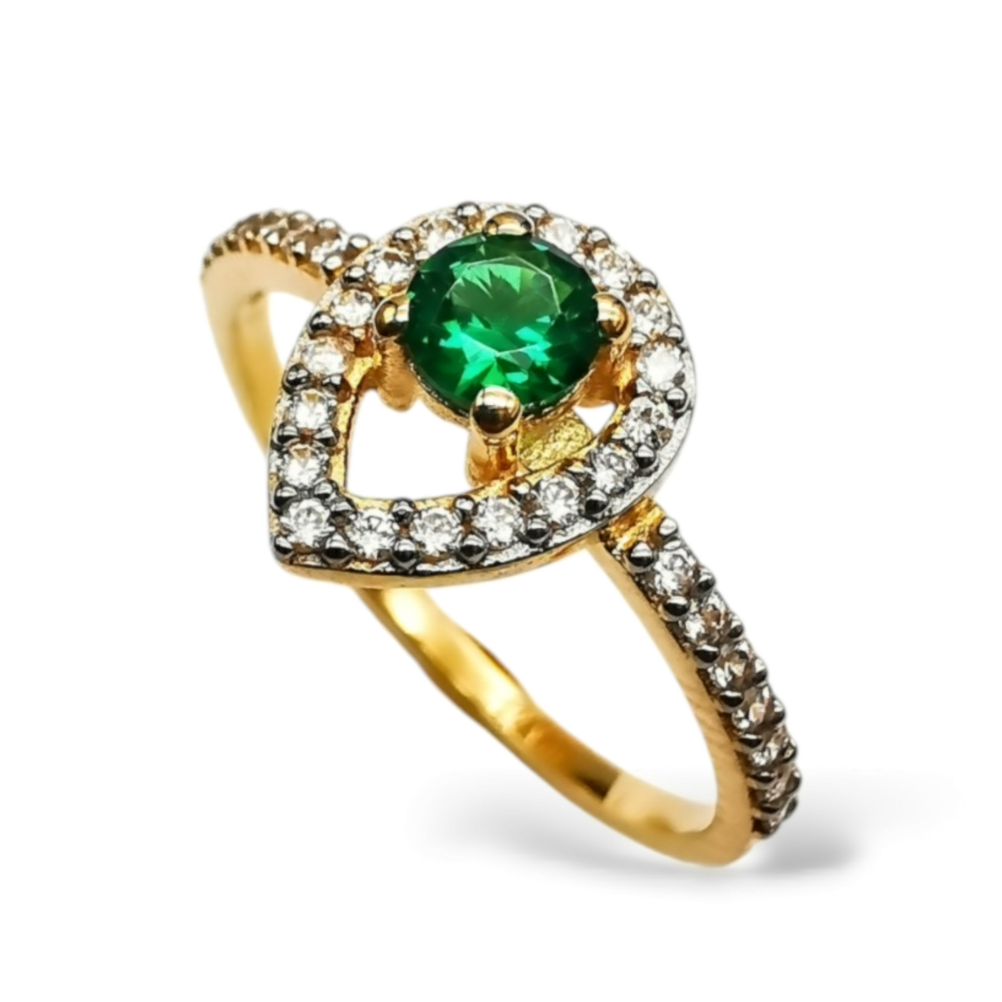 Δαχτυλίδι ροζέτα σχέδιο δάκρυ απο κίτρινο χρυσό 14άρων καρατίων, με κεντρική πράσινη και λευκές πέτρες ζιργκόν στην επιφάνεια του.Βάρος 1,8γρ.