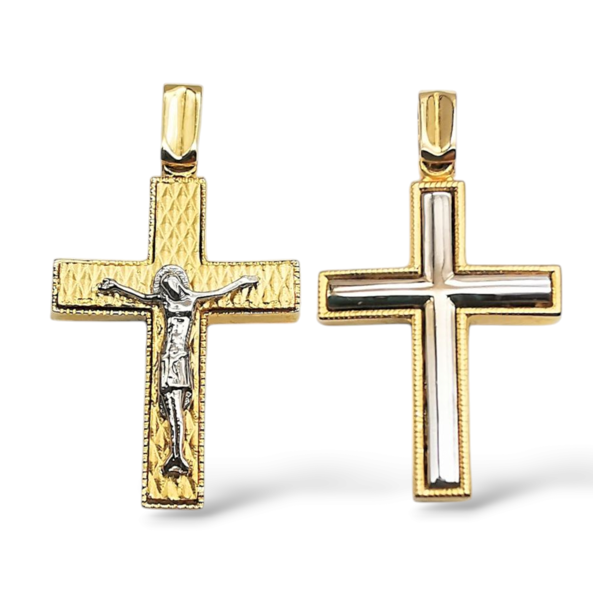 Δίχρωμος Σταυρός διπλής όψεως από χρυσό 14άρων καρατίων.Βάρος 4γρ.Διάσταση 2,35Χ1,7cm.Κρίκος 8 χιλιοστά (συνολικό ύψος 3,15cm).Φάρδος 4,3 χιλιοστά.