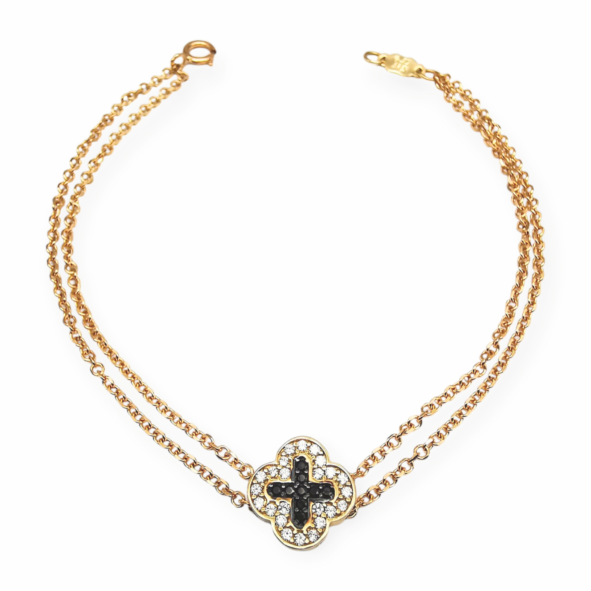 Χειροποίητο γυναικείο βραχιόλι 14άρων καρατίων με διπλή αλυσίδα και σχέδιο σταυρού στο κέντρο,αποτελούμενο από λευκά και μαύρα ζιργκόν.Βάρος 3γρ.